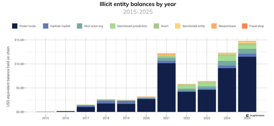 Chainalysis estimated that illicit entities held nearly $15 billion in October 2025, with stolen funds representing the largest share. This is a new record high, partly due to an increase in the price of crypto assets in 2025.